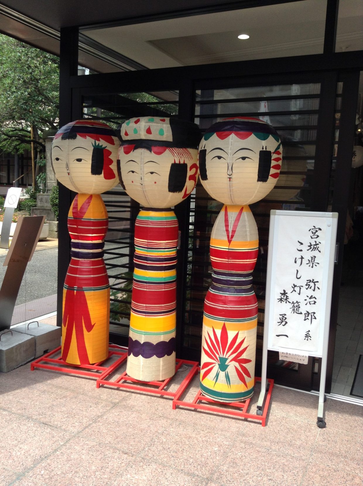 !? 燈籠がない…ですと…? 人気がありそうなのに…何か理由があるのか? ちょうちんって決まってるとか……? おとなりの会館の入り口にありました。こけし灯籠。
